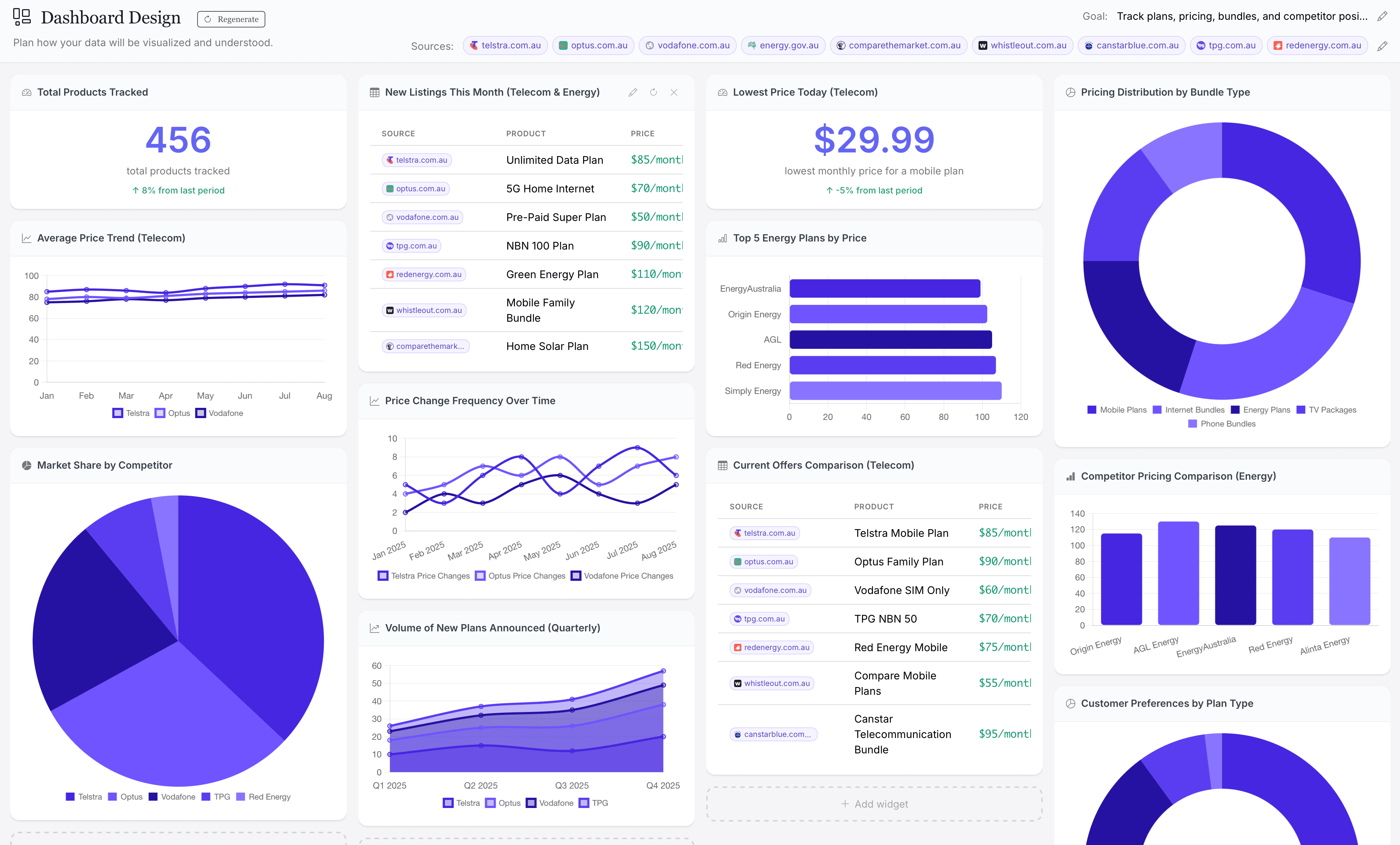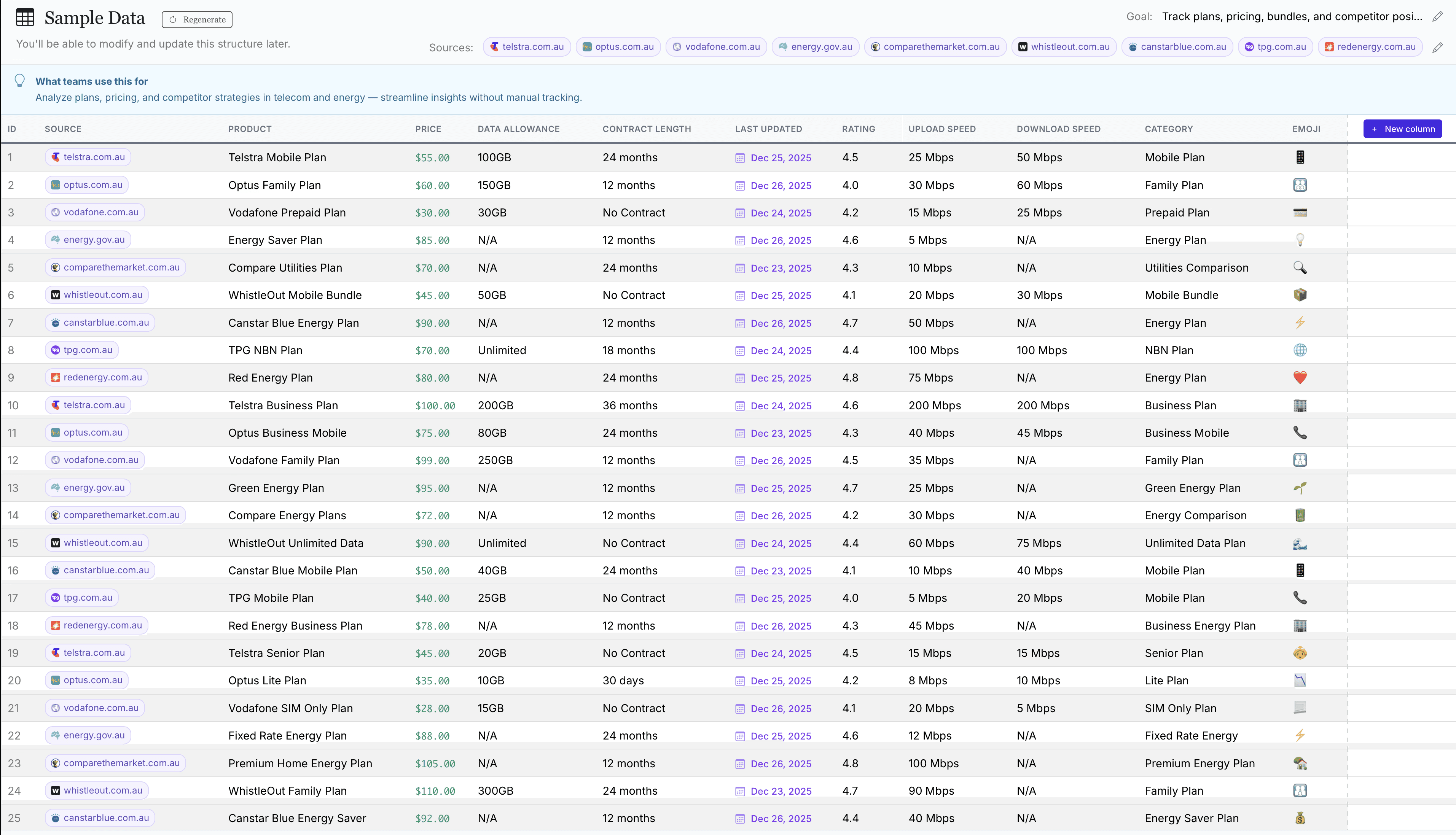 Benchmark simulates energy quote journeys to extract structured data on tariffs, fixed vs variable rates, contract terms, fees, and regional pricing. Teams use it to monitor competitor strategies across geographies and customer profiles — with no manual data pulls or engineering overhead.